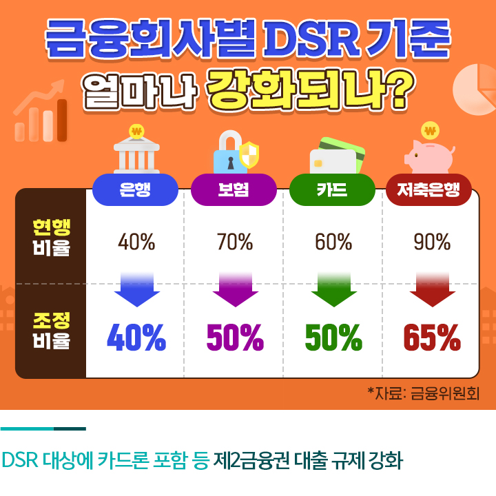 개인별 DSR 규제 강화로 인한 대출 풍선효과를 막기 위해 정부는 제2금융권 대출 규제 또한 강화할 방침인데요. 제2금융권에 적용되는 개인별 DSR 기준은 기존 60%에서 50%로 하향 조정되었습니다. 제2금융권에 대해서는 금융회사별 DSR 기준도 강화됩니다. 현재 보험, 카드, 저축은행 등 각 업권의 평균 DSR 규제는 70%~160%인데요. 2022년부터는 업권에 따라 최소 50%에서 최대 100% 선으로 규제가 강화될 예정입니다.