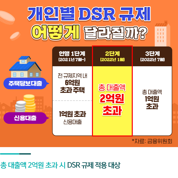 2022년 1월부터 은행에서 대출을 2억원 넘게 받으려면 원리금 상환액이 연봉의 40%를 넘겨선 안됩니다. 금융위원회의 가계 부채 관리 강화 방안에 따라 내년 1월 개인별 DSR 2단계 규제가 시행되기 때문인데요. 현재는 DSR 규제 1단계로 2021년 7월부터 전 규제 지역 내 6억원 초과 주택에 대한 주택담보대출과 1억원을 초과하는 신용대출에 대해 DSR 40% 규제가 적용되고 있습니다.