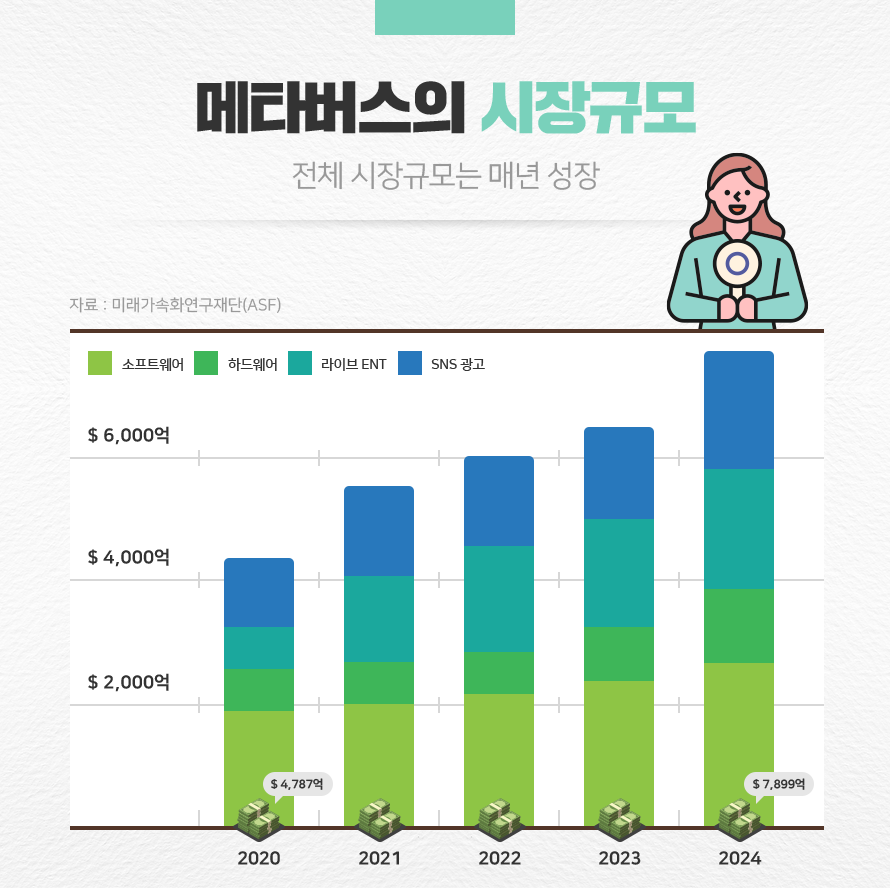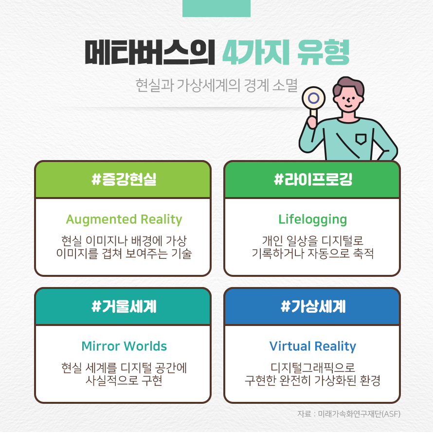 5G 서비스 상용화와 메타버스 세계를 구현할 인공지능(AI), 가상현실(VR), 증강현실(AR) 기술의 발전으로 메타버스는 전 세계가 주목하는 미래 먹거리로 급부상하고 있습니다. 또한 현실과 상호작용하거나 사회·경제·문화 등 현실의 활동이나 기능을 영위할 수 있다는 점에서 메타버스에 대한 사람들의 기대감도 커지고 있습니다.