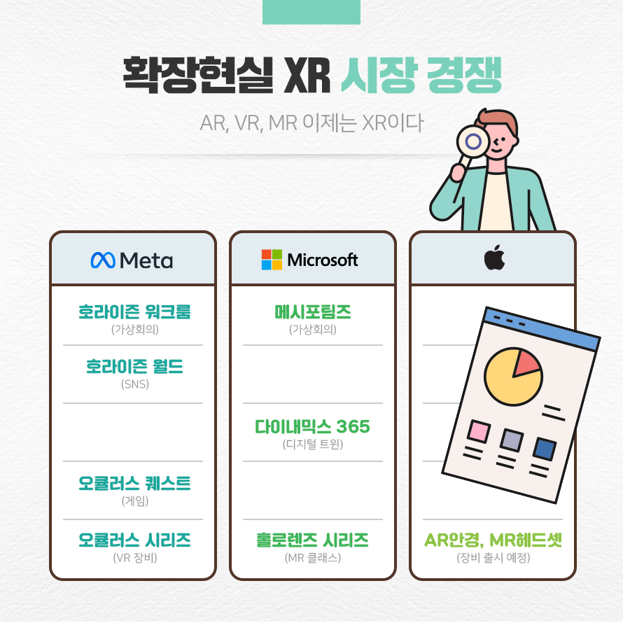 이미 글로벌 빅테크 기업들은 VR(가상현실), AR(증강현실)를 넘어 MR(혼합현실), XR(확장 현실) 분야에 다양한 하드웨어를 쏟아내고 있으며 수많은 콘텐츠 기업들이 이를 이용한 게임과 가상체험 엔터테인먼트 콘텐츠를 만들거나 가상공간에서 여러 사용자와 소통할 수 있는 플랫폼을 선보이고 있습니다.