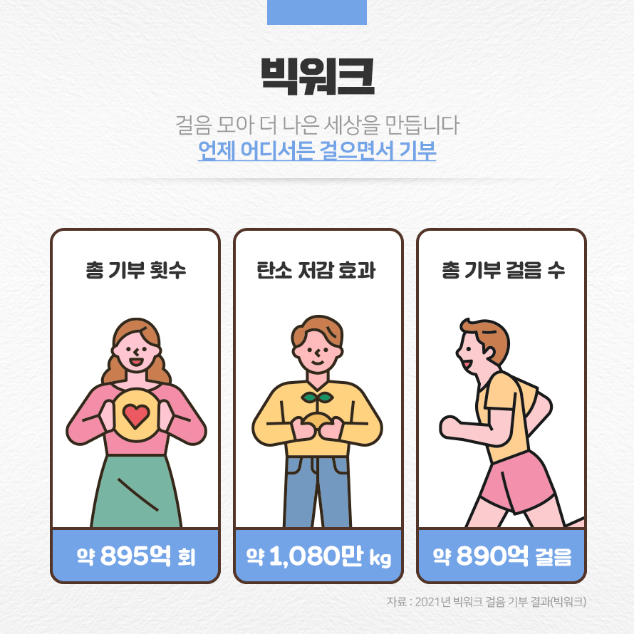 개발자는 사람들이 기부에 대한 의지는 있으나 실제 행동으로 옮기는 데 어려움을 겪는 것을 보고 좀 더 쉽고 편하게 기부할 수 있는 방법을 찾다가 이러한 앱을 개발했다고 합니다. 2012년부터 시작된 빅워크 기부 캠페인은 누적 다운로드 수 약 85만 회를 넘어섰으며 약 298개 기업, 기관 등이 캠페인을 진행해서 2021년 기준 약 70억원을 기부했습니다. 총 기부 횟수는 약 895억 회, 걸음이 만든 탄소 저감 효과는 약 1,080만 kg, 총 기부된 걸음 수는 약 890억 걸음에 달합니다.