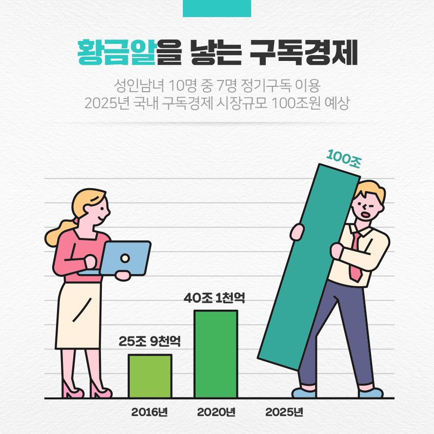 구독경제 열풍은 온·오프라인 전역으로 확산되고 있습니다. 과거 신문이나 우유 배달로 시작된 구독 서비스는 동영상과 음악 등 콘텐츠 영역으로 확장되었고, 이동통신사는 물론이고 e커머스 기업, 편의점과 백화점, 식품업체까지 충성 고객을 유치하고 안정적 수익 모델을 확보하기 위해 정기구독 모델을 빠르게 도입하면서 구독 서비스 관련 시장은 폭발적으로 성장하고 있습니다.