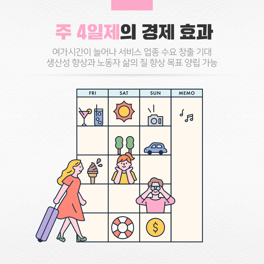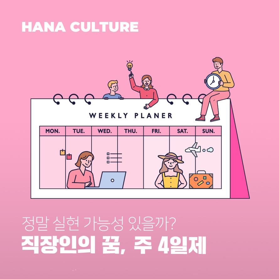 장시간 노동으로 인한 생산성 저하로 발생되는 사회적인 문제, 일과 삶의 균형인 ‘워라밸’을 중요시하는 사회 분위기 속에서, 코로나19 바이러스 확산을 막기 위해 적용된 탄력근무 시스템이 빠르게 자리 잡으면서 자연스럽게 사람들의 관심이 주 4일제 도입으로 옮겨가고 있습니다.