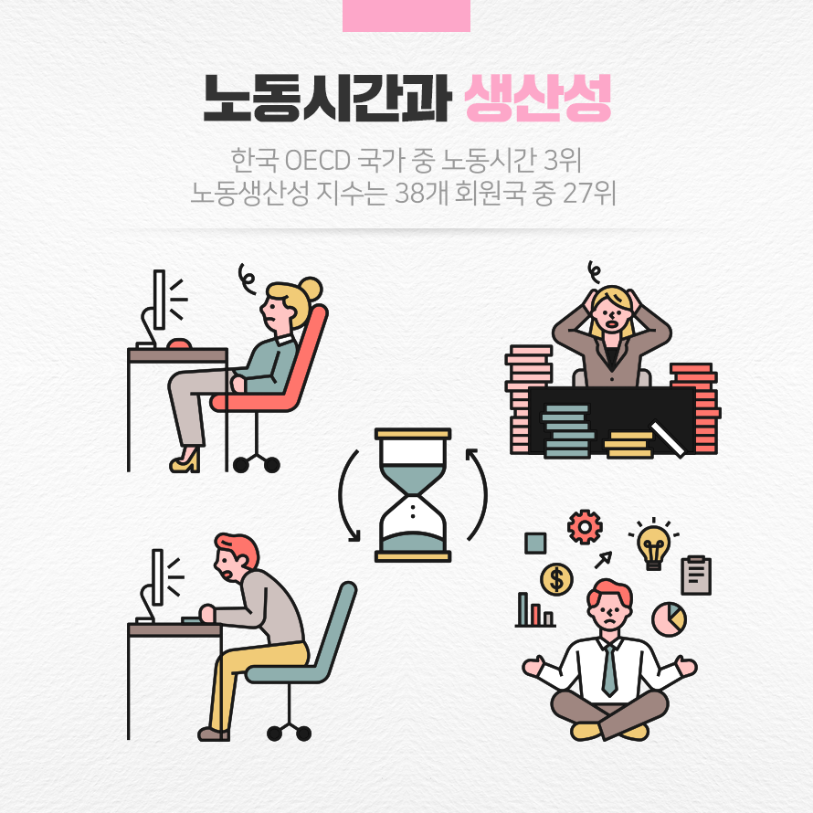 전문가들은 한국의 야근 문화와 필요 이상 긴 근로시간이 생산성을 떨어트리는 것으로 평가하며, 한국이 ‘적게 일하고 많이 버는 나라’가 되려면 노동 유연성을 높여야 한다는 분석을 내놓고 있습니다. 이런 분석을 바탕으로 주 4일제를 통해 일과 삶의 균형을 유지하고 근무 시간에 집중도를 올려 노동생산성 높여야 한다는 주장에 힘이 실리고 있습니다.