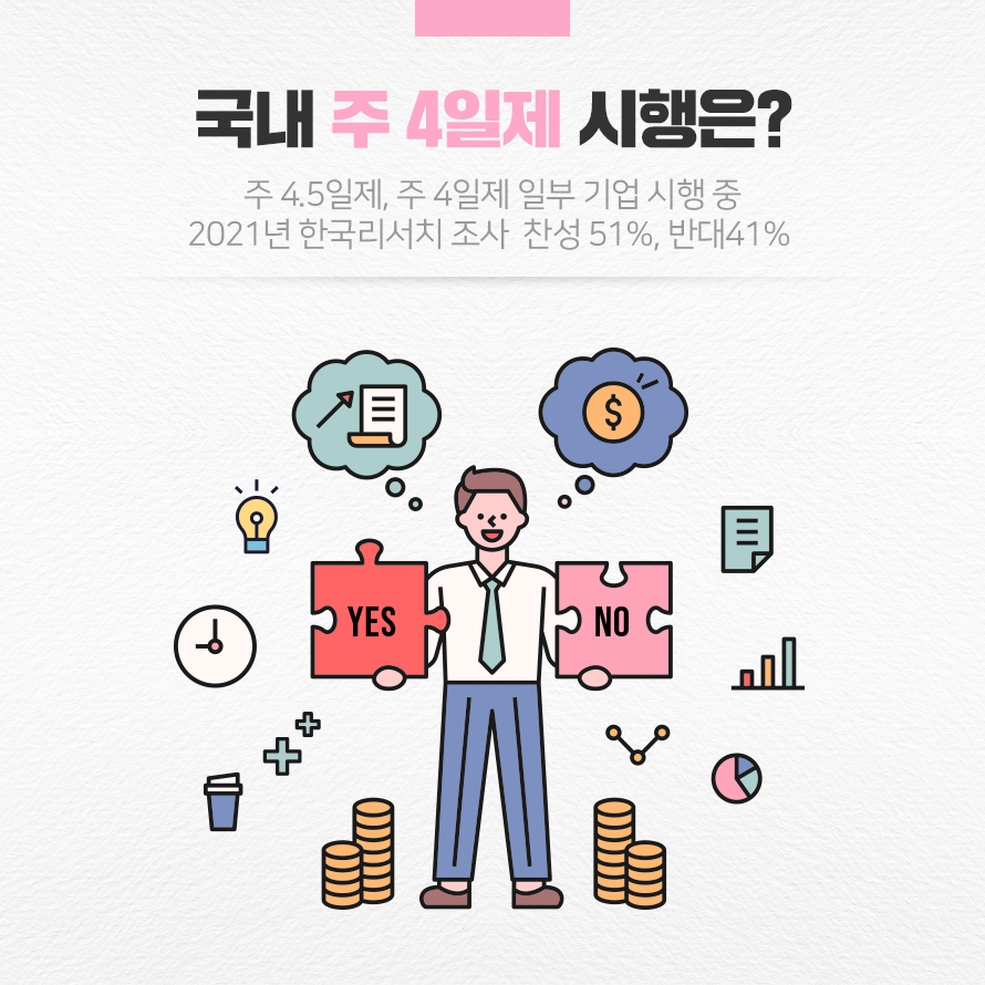 우리나라도 일부 기업을 중심으로 주4.5일제 또는 주 4일제를 부분적으로 시행하고 있습니다. 교육 분야의 한 기업은 임금은 기존과 동일하게 유지하면서 주중 하루를 자유롭게 쉴 수 있는 ‘드림데이’로 지정해 주 4일제를 운영하고 있습니다.