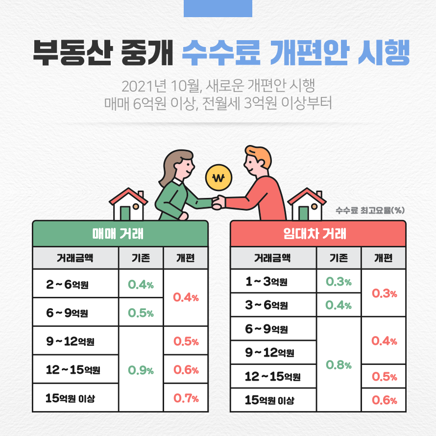 부동산 거래를 해보셨던 분들은 한 번쯤 중개 수수료가 부담된다고 느끼셨을 텐데요. 2021년 새로운 부동산 중개 보수 개편안이 시행되며 중개 수수료가 낮아졌다는 사실을 알고 계시나요? 오늘은 변경된 부동산 중개 수수료에 대해 자세히 알아보도록 하겠습니다.