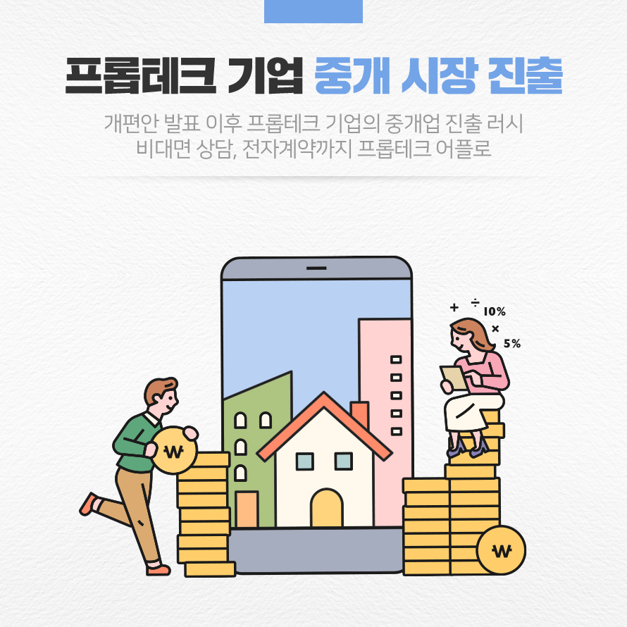 정부의 부동산 중개 수수료 개편안 발표 이후 프롭테크 기업들의 중개업 진출이 이어지고 있습니다. 프롭테크란 ‘부동산(Property)’과 ‘기술(Technology)’의 합성어로 빅데이터 등 신기술을 도입한 부동산 비즈니스를 일컫는 말입니다.
