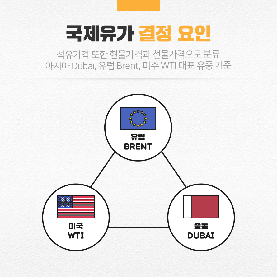 통상 석유 시장은 아시아, 유럽, 미주의 세 개 권역으로 구분되며 각 권역을 대표하는 기준 유종으로 중동의 두바이유, 미국의 WTI, 유럽의 브렌트유가 거래가격을 결정하는 지표로 쓰입니다. 아시아 시장의 경우에는 두바이를 기준으로 프리미엄(조정계수)을 가감해 가격을 결정합니다.