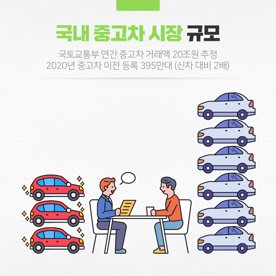 국토교통부의 조사에 따르면 2020년 중고차 이전 등록대수는 395만대로 신차 등록대수인 191만대보다 2배 더 많았고, 연간 중고차 거래액 규모는 20조원이 넘을 것으로 추정하고 있습니다.