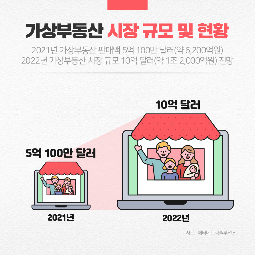 메타버스 데이터 제공업체 메타메트릭솔루션스에 따르면 글로벌 4대 메타버스 부동산 플랫폼의 2021년 가상부동산 판매액은 5억 100만 달러(약 6,200억원)이며, 2022년 규모는 그 두 배에 달하는 10억 달러(약 1조 2,000억원)에 달할 것으로 보고 있습니다.