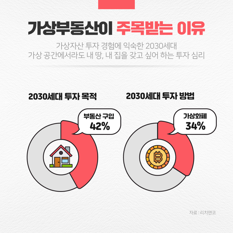 사람들은 왜 가상부동산에 주목하고 있을까요? 전문가들은 2030세대가 메타버스라는 가상 공간에서라도 내 땅, 내 집을 갖고 싶어 하는 투자 심리가 반영되었다고 보고 있습니다. 수도권에 거주하는 2030세대 직장인 1,000명을 대상으로 진행한 리치앤코 설문조사 결과에 따르면, 직장인 83%가 투자하고 있으며, 그 이유로 ‘부동산 마련(42%)’이 가장 높게 나타났습니다. 매일같이 가격이 급등하는 부동산 시장에서 집을 마련하고자 노력하는 것에 지치고, 비트코인과 같은 가상자산 투자 경험에 익숙한 2030세대들이 메타버스에서 초기 시장을 선점하고자 적극적으로 나서고 있다는 것입니다.