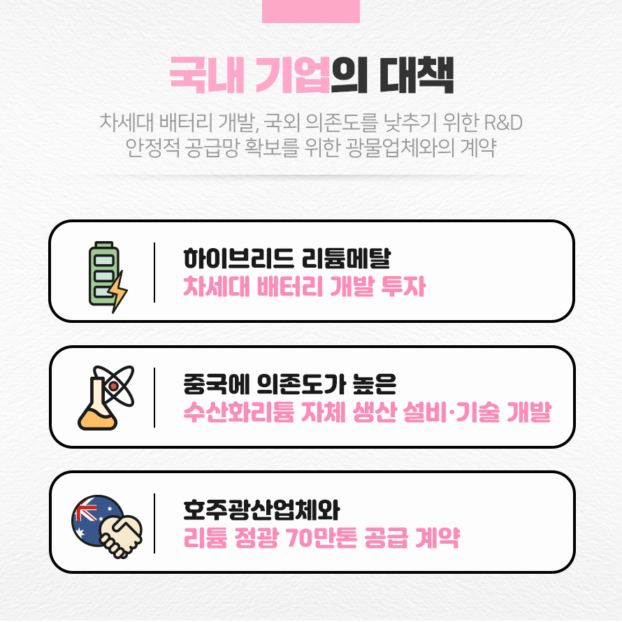 동시에 안정적인 원자재 확보에도 전력을 기울이고 있습니다. 국내 1위 에너지 기업 L사에서는 2024년부터 2028년까지 5년간 리튬 정광 70만톤을 공급받는 내용으로 2022년 1월 호주 광산 업체와 계약을 체결했습니다. 1회 충전으로 500km 이상 주행할 수 있는 고성능 전기차 약 250만 대 분의 배터리를 만들 수 있는 리튬 정광 70만톤을 확보함으로써 안정적인 공급망을 구축하였습니다. 이 외에도 중국 최대 리튬 생산업체 K사의 지분을 매입하는 등 안정적으로 리튬을 확보하기 위한 국내 기업들의 행보가 나타나고 있습니다.