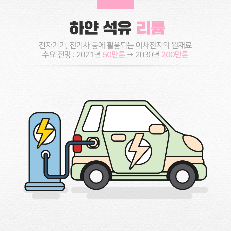 리튬은 지구상에서 세 번째로 가벼운 알칼리 금속 물질입니다. 작고 가벼워 단위당 에너지 밀도가 높아 고전압의 가벼운 배터리를 만들 수 있어 이차 전지 제작을 위해 사용됩니다. 이차전지는 휴대용 전자기기뿐만 아니라 전기 자동차, 로봇 산업 등 미래 산업에 꼭 필요한 존재인 만큼 원재료인 리튬의 중요성 역시 나날이 커지고 있습니다. S&P글로벌플래츠는 리튬의 수요가 2021년 50만톤에서 2030년 200만톤으로 늘어날 것으로 전망하고 있습니다.