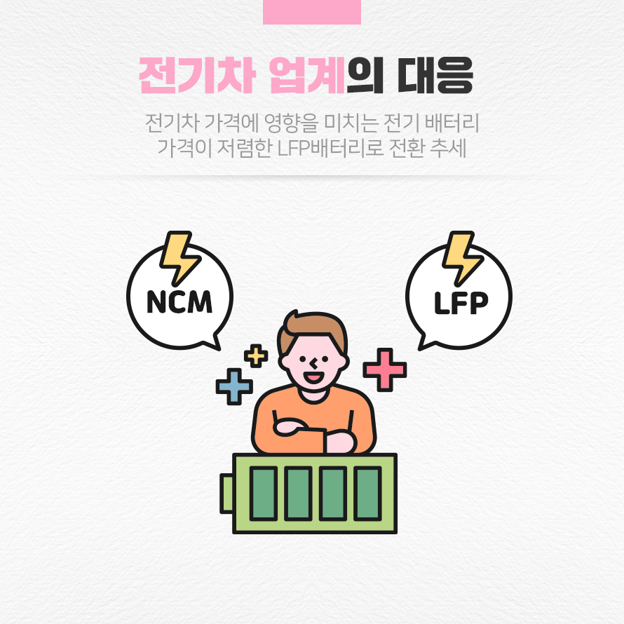 전기차 업계에서는 배터리 가격을 낮추기 위하여 NCM(리튬, 니켈, 코발트, 망간) 대신 LFP(리튬인산철)배터리로 전환하고 있습니다. NCM은 높은 에너지 밀도로 LFP보다 주행거리가 길다는 것이 강점이 있는 반면, LFP는 주행거리가 짧은 대신 가격이 저렴하고 화재 내구성이 강한 것이 특징입니다. 전기차 시장에서는 NCM보다 저렴한 LFP를 택해 시장 우위를 확보하기 위한 움직임이 나타나고 있습니다. 이러한 시장의 흐름은 NCM배터리를 주력으로 하는 국내 배터리 업계에 악재로 작용하고 있습니다.