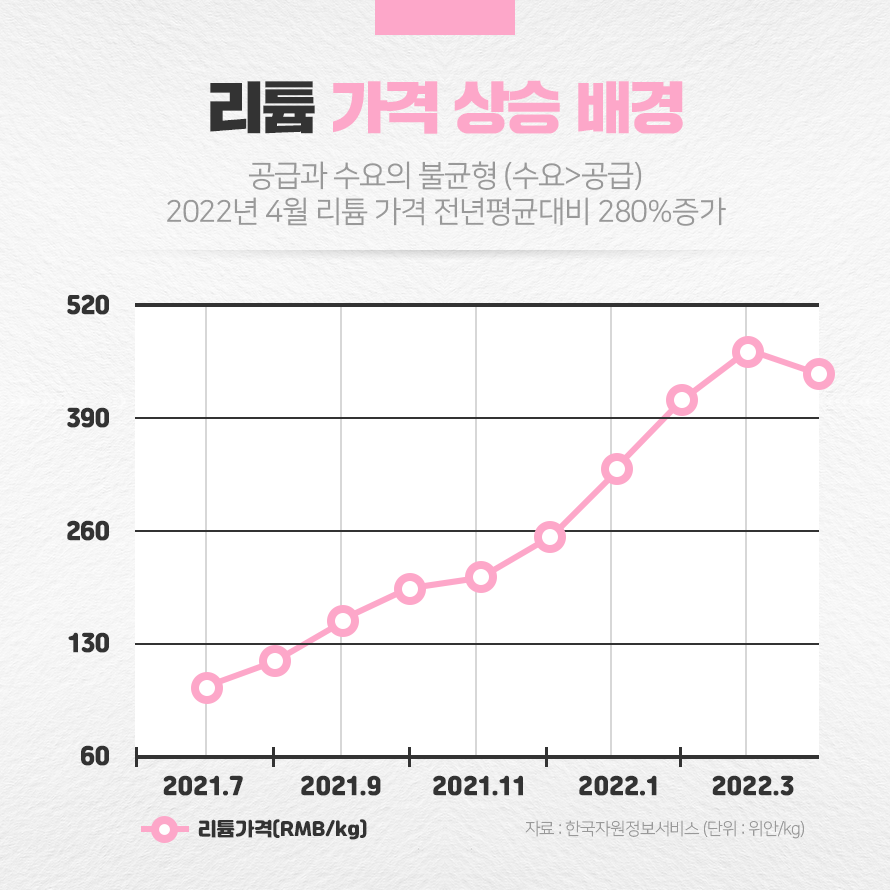 풍부한 매장량에도 불구하고 공급 대비 수요가 많아지며 최근 리튬의 가격이 오르고 있습니다. 한국자원정보서비스(KOMIS)에 따르면, 2017년 7월 이래로 리튬 가격은 계속해서 증가했으며, 2022년 4월에는 kg당 452.31위안(약8만 6천원)으로 전년평균대비 280% 증가했습니다.