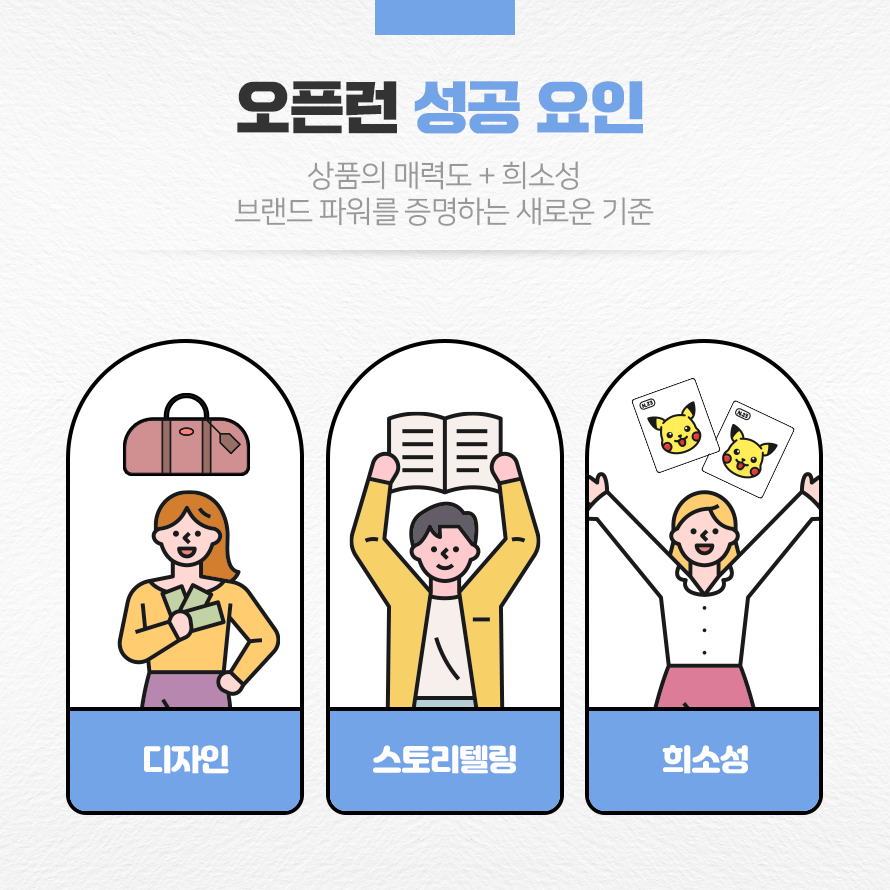 오픈런은 브랜드 파워를 증명하는 하나의 기준이 되었으며, 명품 및 한정판 상품을 넘어 포켓몬빵, 박재범 소주로 유명한 원소주 등 히트 상품을 만들어내고 있습니다. 단순히 가격이 높거나 한정판이라고 해서 오픈런이 발생하는 것이 아닙니다. 소비자가 구매할 만큼 ‘매력적인 디자인’과 ‘스토리텔링’, ‘소유했을 때 남들의 부러움을 얻을 수 있는 제품’인지가 가장 중요한 요인입니다. 이러한 요인이 한정판이라는 매력과 결합했을 때, 가격 상승이 이뤄지기도 하고 중고 거래 시장에서 높은 가격에 거래가 이루어지게 됩니다. 웃돈을 주고 살 만큼 소유하고 싶은 욕망을 불러일으키는 브랜드가 성공적인 오픈런을 이끌어낼 수 있습니다.