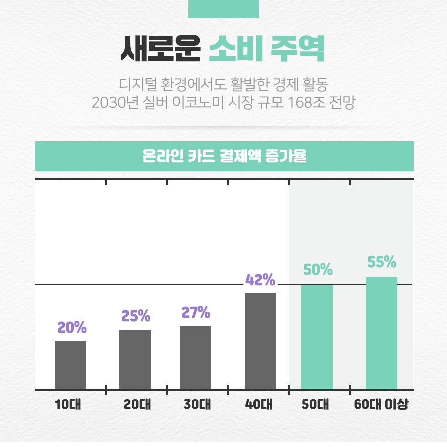 온라인 카드 결제액 역시 20대 다른 연령층에 비해 중장년층의 증가 폭이 높게 나타났습니다. 하나금융연구소에 따르면 온라인 카드 결제 금액 증가율은 50대 50%, 60대 이상 55%로 나타났습니다. 신한카드 빅데이터 연구소가 2019~2021년 신한카드 개인회원의 디지털 소비 데이터를 분석한 결과에서도 60대 이상의 온라인 업종 결제액이 142% 증가했다고 나타났습니다. 이렇듯 액티브 시니어는 온라인 시장에서 역시 핵심 소비층으로 활동하고 있습니다.