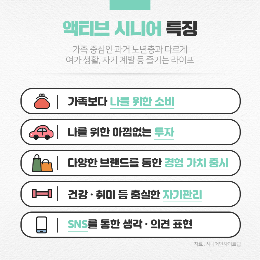 액티브 시니어는 가족 중심적인 과거 노년층과 다르게 주체적이고 적극적인 라이프 생활을 즐깁니다.