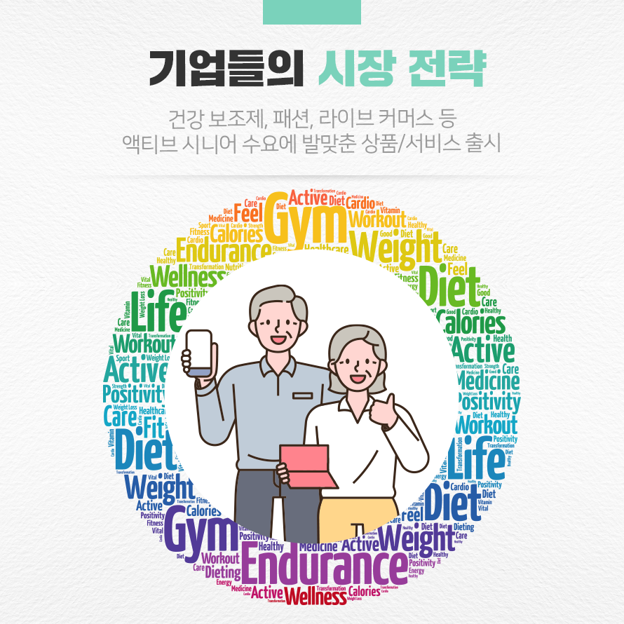 액티브 시니어는 가족과 국가의 봉사를 필요로 하는 노인의 모습에 반기를 들며 우리 사회의 중요한 소비 주체로 자리 잡았습니다. 새로운 라이프 스타일을 가진 액티브 시니어를 어떻게 사로잡냐에 따라 앞으로의 시장 판세가 달라질 것으로 보입니다.