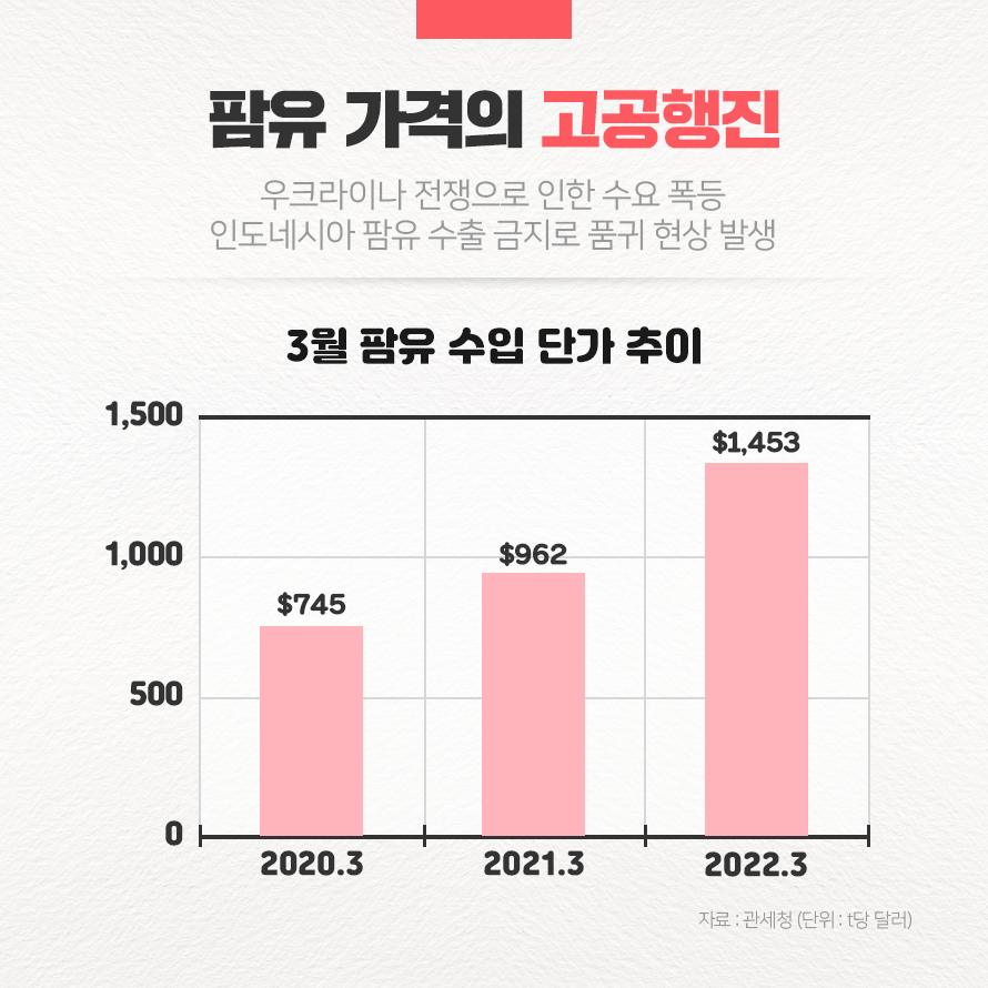 전 세계적으로 수요가 많고 생활용품의 주요 원료인 만큼 전 세계가 팜유 가격을 주목하고 있는데요. 우크라이나에서 발발한 전쟁을 시작으로 인도네시아 팜유 수출 금지가 더해지며 팜유 가격이 한동안 상승세를 유지했습니다. 관세청에 따르면 2022년 3월 수입 팜유 가격은 1톤(t)당 1,453달러(약 184만원)로 역대 최고 수준으로 나타났습니다.