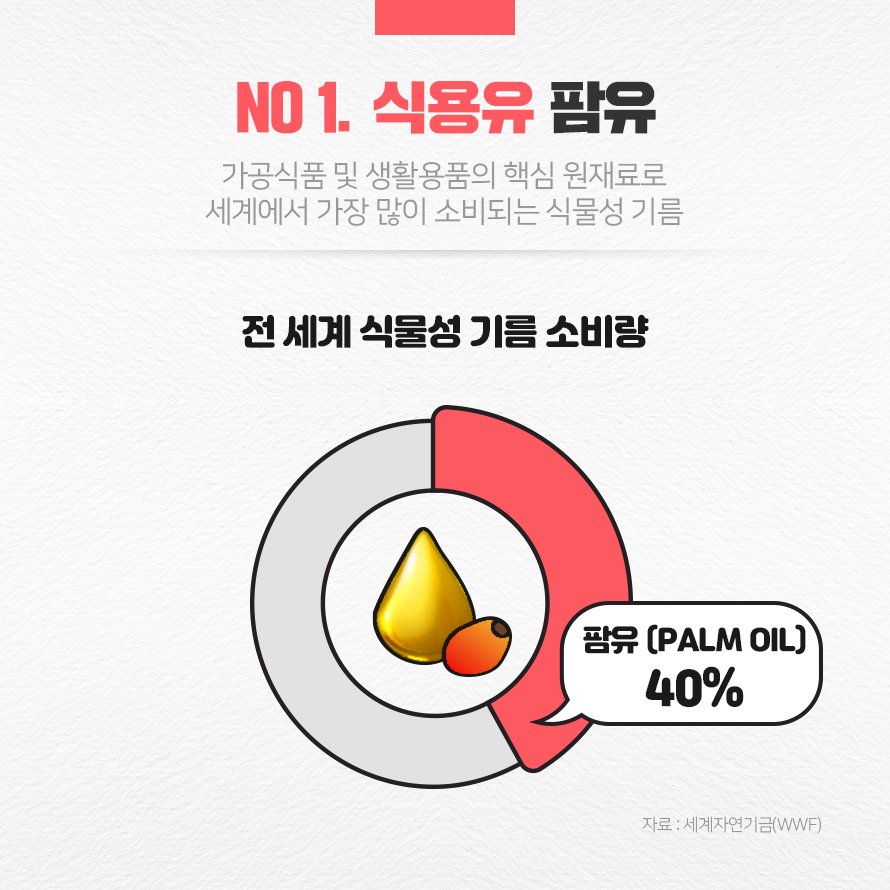 팜유는 전 세계 식물성 기름 소비량의 40%를 차지하며, 그 수요는 계속 증가하고 있습니다. 세계자연기금(WWF)은 팜유 수요량이 2025년에는 최대 4억 7,000만M/T(메트릭톤, 중량 단위로 1,000kg을 1톤으로 하는 중량 단위)에 달하며 2020년에 비해 최대 6배 증가할 것으로 전망했습니다. 국내에서도 팜유 소비량이 많은데요. 농림식품부에 따르면 국내 팜유 연간 소요량은 20여만톤 수준으로 국내 식용유 중 2번째로 가장 많이 소비되고 있다고 합니다.