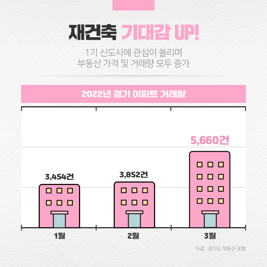 부동산 가격 상승세에도 불구하고 매매 거래 수도 증가하고 있습니다. 경기도 부동산 포털에 따르면 2022년 3월 경기 지역 아파트 거래량은 5,660건으로 올해 최대치로 나타났습니다. 특히 2022년 3월 분당이 있는 성남시는 258건(▲138%), 일산이 위치한 고양시는 538건(▲96%), 평촌이 있는 안양시는 170건(▲95%)이 매매되며 2022년 2월보다 모두 증가했습니다.