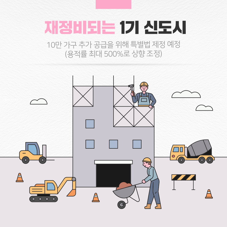 대통령직인수위원회에서는 임기 내 250만 가구 이상 주택 공급을 위한 계획 중 하나로 1기 신도시 재건축 요건 완화를 내세웠습니다. 1기 신도시 내 10만가구 이상 추가 공급을 위해 1기 신도시 특별법을 제정하고 용적률을 높이는 것이 핵심입니다. 이때 용적률이란 건축물을 얼마나 높게 지을 수 있는지를 결정하는 지표로, 이를 최소 300%에서 최대 500%까지 높여 가구 수를 늘리겠다는 계획입니다.
