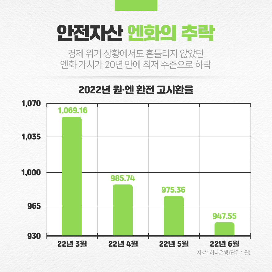 탄탄한 자산을 보유한 경제 대국인 만큼 30년간의 경제 침체에도 불구하고 엔화는 안전자산으로서의 위치를 유지해 왔는데요. 그런데 엔화의 가치가 무려 20년 만에 최저 수준으로 떨어지며 엔화의 가치가 몰락했다는 이야기가 나오고 있습니다. 2022년 고시 환율에 따르면, 3월 7일 1,069.16원이었던 엔화의 가치가 4월 7일 985.74원, 5월 6일 975.36원, 6월 7일 947.55원으로 계속해서 하락하고 있습니다.