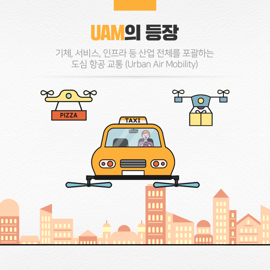 UAM은 Urban Air Mobility의 약자로 도심 항공 교통을 뜻합니다. 승객이나 화물을 운송하는 기체만 뜻하는 것이 아니라 서비스, 관련 인프라, 운용 시스템, 유지보수 등 관련 산업 전반을 포괄하는 개념입니다. 2016년 10월 승차 공유 서비스 제공 기업 우버(Uber)가 차세대 성장 사업으로 UAM을 선정하여 주목받기 시작했으며, 현재는 UAM 시장을 선점하기 위해 항공기 제작사뿐만 아니라 자동차 기업, 스타트업 등 글로벌 기업 간의 경쟁이 이루어지고 있습니다.