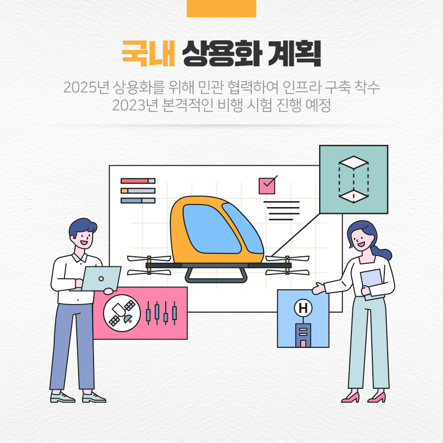 국토교통부에서는 K-UAM 인증 사업을 통해 민관이 협력하여 국내 여건에 맞는 안전기준 마련, 시험, 실증 지원 등을 추진하고 있습니다. 2021년 4월에는 인천국제공항공사와 H건설, K통신사 등이 이착륙장 및 인프라 구축에 착수했습니다. 인천국제공항공사는 인천공항 내 UAM 인프라 구축과 운영을 담당하고, H건설은 버티포트의 구조와 제반 시설의 설계 및 표준안을 마련하며, K통신사는 UAM 통신 인프라를 구축하고 에어-그라운드(Air-Ground) 연계 모빌리티 사업모델 및 UTM(Unmanned aerial system Traffic Management: 드론 교통관리) 시스템을 개발하고 있습니다. 2022년에는 참여 기관을 모집하고 실증대상 방법 협의를 하여 2023년부터 본격적인 비행 시험을 진행할 예정입니다.