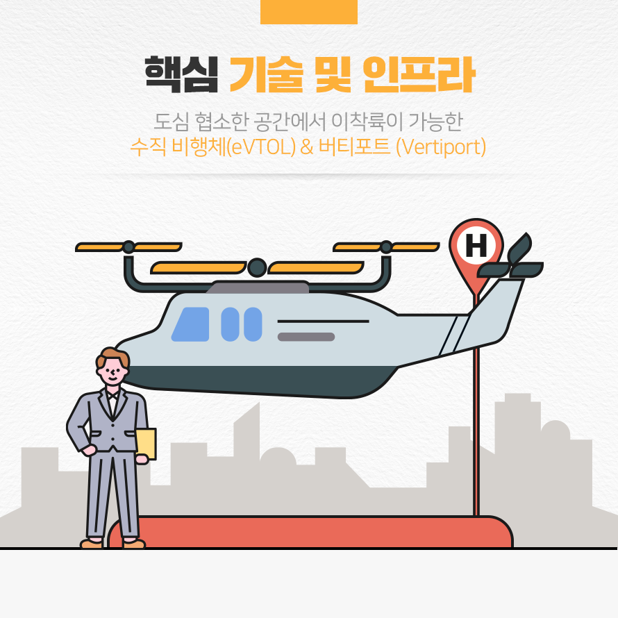 UAM의 핵심은 수직 비행체 ‘eVTOL(electric Vertical Take-off Landing)’과 수직 공항 ‘버티포트(Vertiport)’입니다.