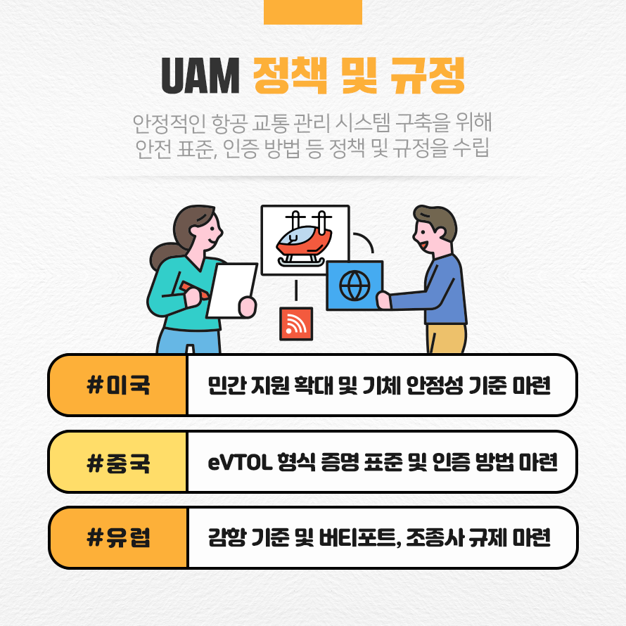 안정적인 항공 교통 관리 시스템이 구축되기 위해서는 관련 정책도 함께 수립되어야 합니다. 세계 각국에서는 안전 표준, 인증 방법 등 UAM 기술 개발에 발맞추어 각종 정책, 규정을 수립하고 있습니다.