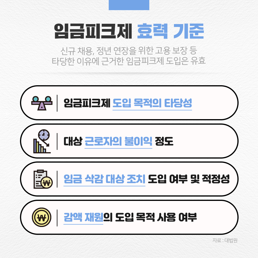 즉 단순히 정년을 보장하기 위해 임금을 깎았다고 해서 무조건 무효가 되는 것은 아닙니다. 임금피크제 도입 시에는 신규 채용 혹은 정년 연장을 통한 고용 보장 등 그에 타당한 이유가 있어야 하며, 단순히 연령이 높아진다는 이유만으로 기업의 비용 절감, 직원 퇴출을 위해 임금을 삭감하는 것은 안 된다는 것입니다.