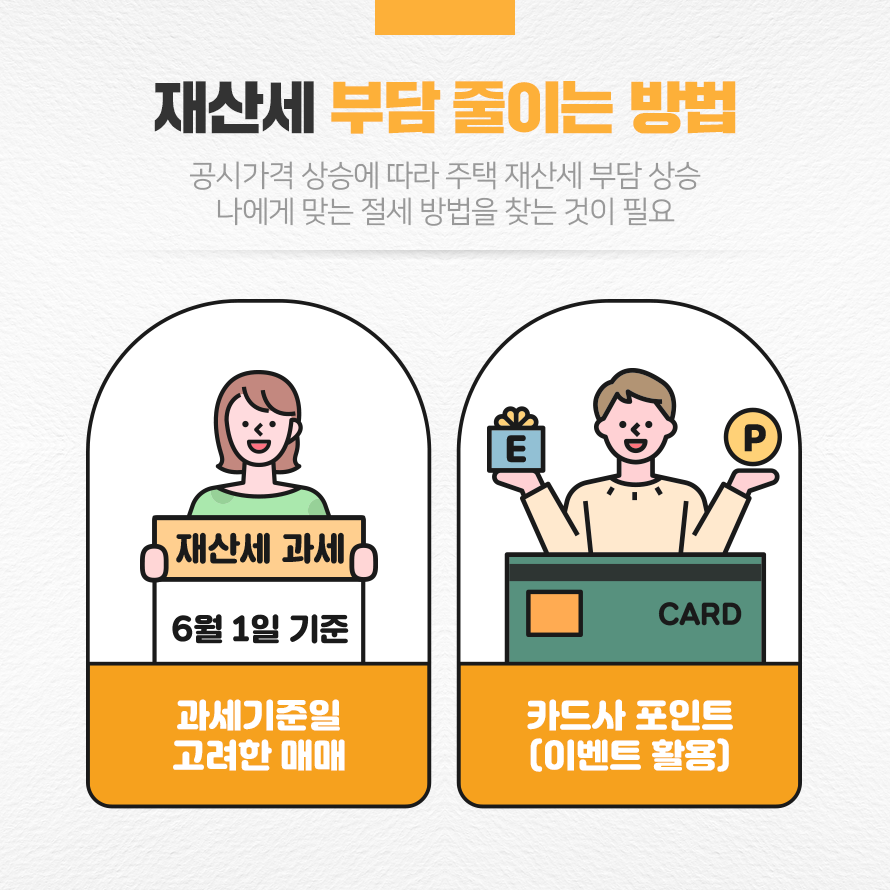먼저 재산을 매매할 때는 과세 기준일을 피하는 것이 좋습니다. 6월 1일을 기준으로 재산을 보유한 사람에게 재산세가 과세하기 때문에 재산을 살 때는 6월 2일 이후로 잔금을 치르고, 재산을 팔 때는 5월 31일 이전 잔금을 처리하는 것이 좋습니다.