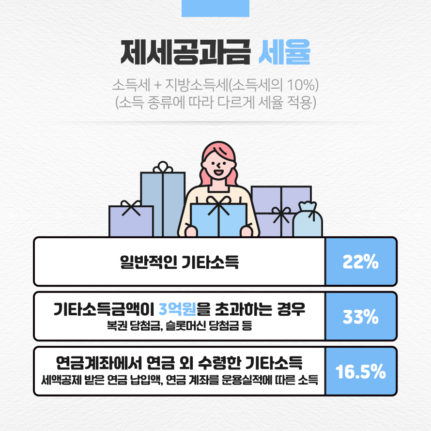 복권 당첨금, 슬롯머신 당첨금 등 기타소득금액이 3억원을 초과하는 경우에는 33%(원천징수세율 30% + 지방소득세 3%)를 과세합니다. 단, 연금식 복권 당첨 시에는 총당첨금액이 아닌 20년간 매월 분할 지급하는 금액에 대해 원천징수세율을 적용하여 제세공과금을 계산합니다. 또한 연금 계좌에서 연금 외 수령 시 소득 세액공제를 받은 연금 납입액이나 연금 계좌를 운용하면서 늘어난 금액에 대해서는 16.5%(원천징수세율 15% + 지방소득세 1.5%)가 부과됩니다.
