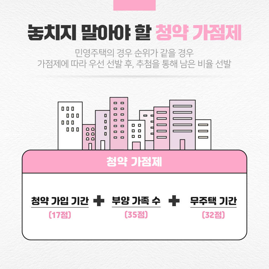 국민주택이 순위 및 순차로 당첨자를 선정하는 것과 달리 민영주택의 경우 가점제와 추첨제 방식을 이용하고 있습니다.