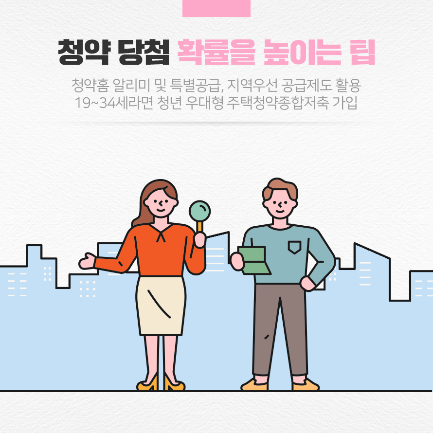 특별공급이나 지역우선공급제도를 활용하는 방법도 있습니다. 특별공급이란 신혼부부, 다자녀가구, 생애 최초 주택구입 등의 특정 조건을 갖춘 무주택자가 주택을 마련할 수 있도록 정부가 지원하는 제도입니다. 일반공급 대상자와 청약 경쟁을 할 필요가 없어 당첨 확률이 높은 편입니다. 지역우선공급제도란 주택 분양 신청자가 동일 순위로 청약 경쟁 시 해당 주택건설 지역 거주자에게 우선 공급하는 제도입니다. 대규모 택지개발지구의 경우 해당 시, 도 거주자에게 일반공급 물량의 50%를 우선 공급한 후 기타지역 거주자에게 나머지 50%를 분양합니다.