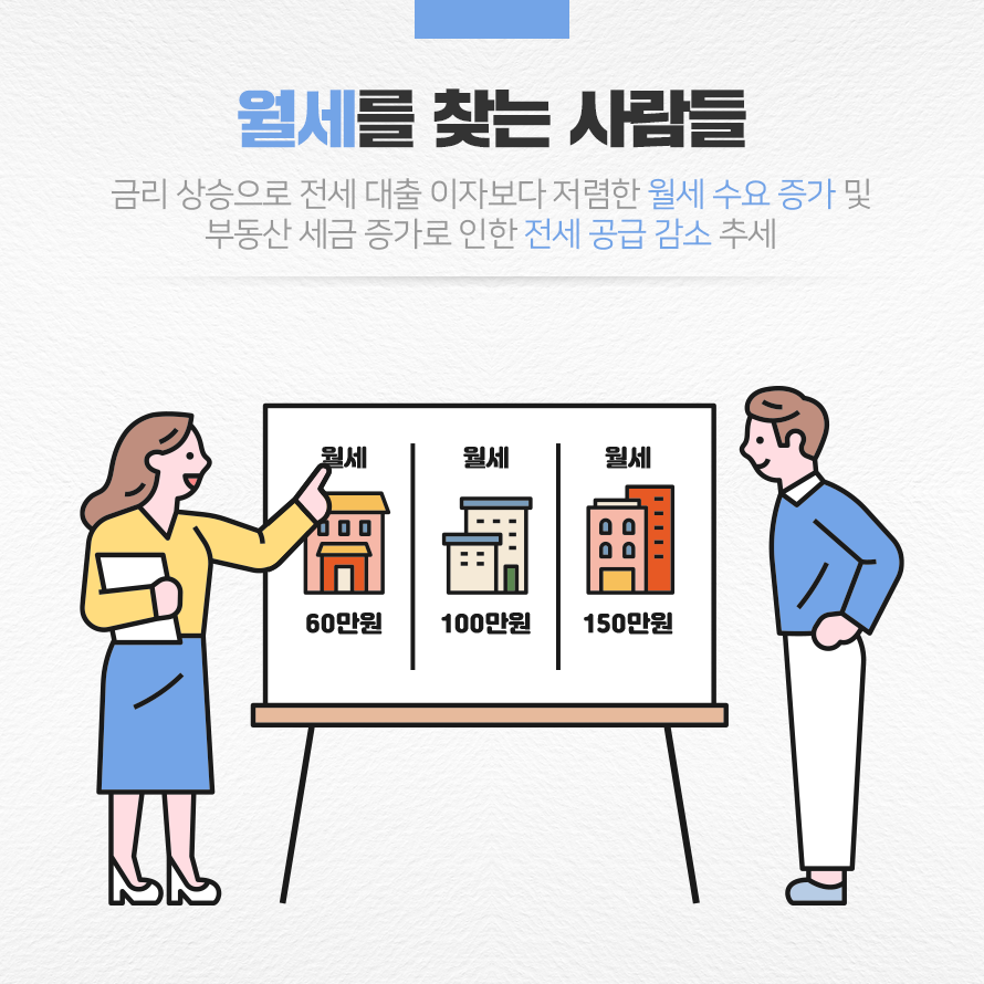 전세의 월세화가 나타나게 된 것은 금리 상승으로 월세에 대한 수요가 높아지고, 부동산 규제 강화로 인해 전세 공급은 감소했기 때문입니다. 금리 인상으로 전세 대출 이자가 월세보다 높아지며 세입자들이 월세를 선호하는 경향이 나타났습니다. 반면, 다주택자에 대한 취득세, 종합부동산세나 재산세, 보유세 등 각종 부동산 관련 세금이 증가하면서 투자수요가 줄고 전세매물이 감소하게 된 것입니다. 이에 임대인들은 늘어난 세금을 납부하기 위해 집을 월세로 전환하여 현금 유동성을 확보하려는 모습을 보이고 있습니다.