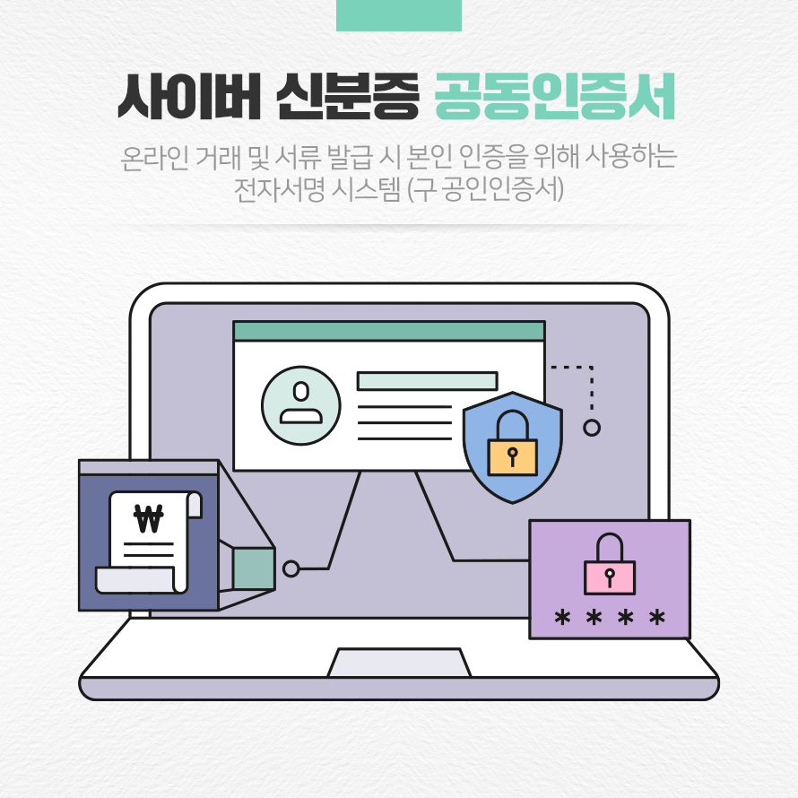 전자서명을 위해서는 전자 인증서가 필요합니다. ‘공동인증서(구 공인인증서)’는 대표적인 전자 인증서로 인터넷뱅킹이나 온라인 증권 거래, 전자 민원 서비스 이용 시 본인임을 증명하기 위해 사용되는 일종의 사이버 신분증입니다.