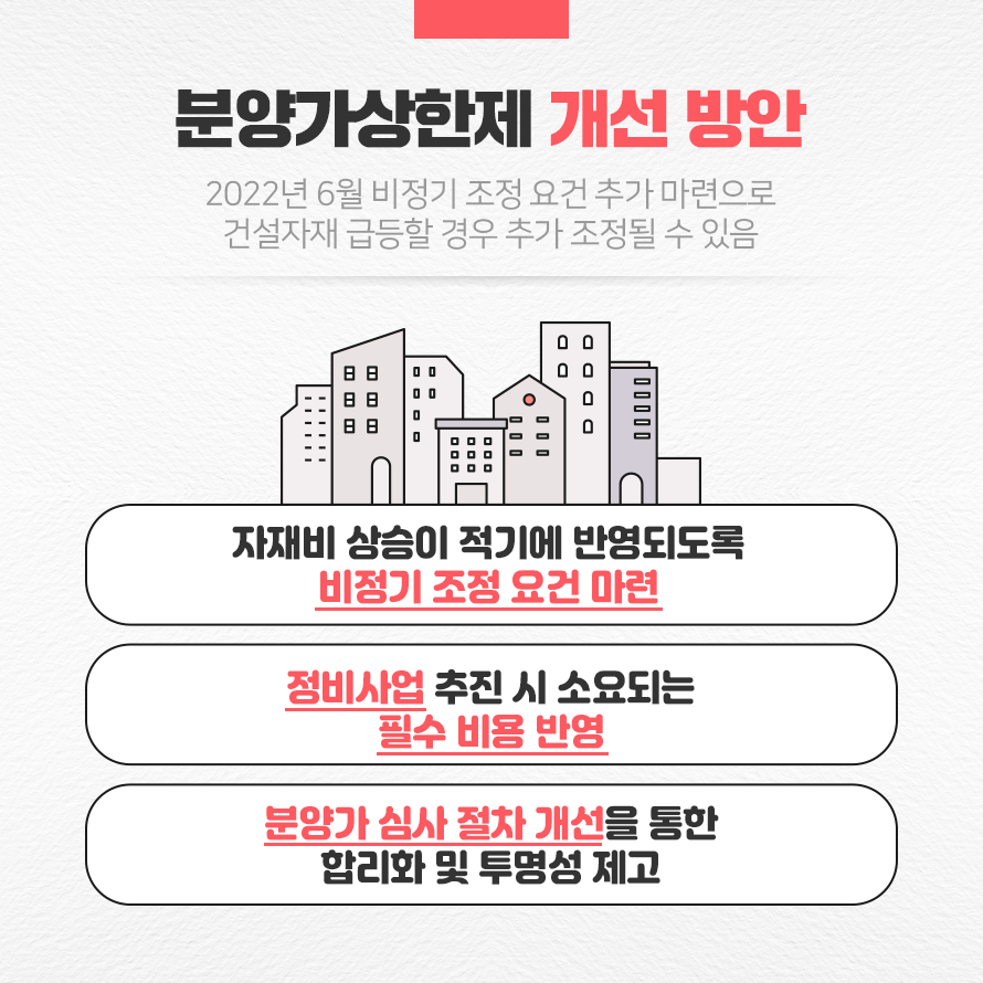 기본형건축비는 주요 건설자재 가격이 급등할 경우 비정기 조정 제도를 통해 추가 조정이 이뤄질 수 있습니다. 특히 2022년 6월 분양가상한제가 일부 개선됨에 따라 물가 상승 시 발생하는 비용을 분양가에 반영하는 것이 보다 용이해졌습니다.