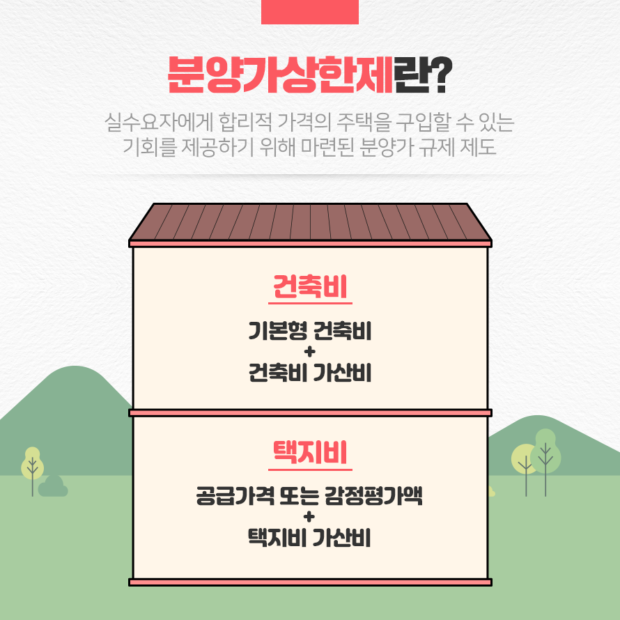 분양가상한제란 공동주택의 분양가격을 산정할 때 일정한 건축비에 택지비를 더하여 분양가를 산정하게 하고, 그 가격 이하로 분양하게 하는 분양가 규제 제도입니다. 공공택지와 공공택지 외 택지에서 주택가격 상승 우려가 있을 경우, 국토교통부 장관이 주거정책심의위원회를 거쳐 규제를 적용합니다.