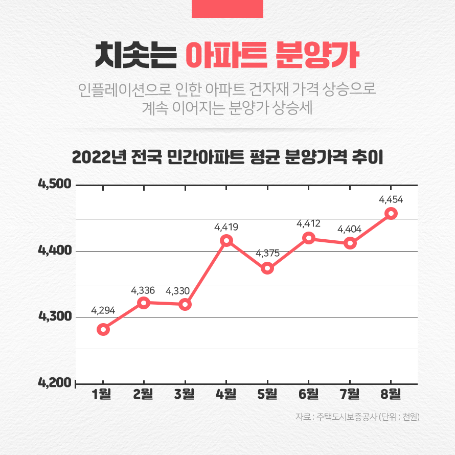 이처럼 아파트 분양가가 크게 치솟고 있는 이유는 인플레이션에 따른 원자재 가격 상승했기 때문입니다. 물가 상승으로 필수 건자재인 철근, 시멘트 등의 가격이 급등하여 건설사들은 분양가를 높이고 있습니다. 하반기 역시 인플레이션이 완화되지 않고, 건자재 인상분을 반영하는 분양가상한제 추가 개편이 있을 경우 분양가는 더욱 크게 오를 수 있다고 전망되고 있습니다.