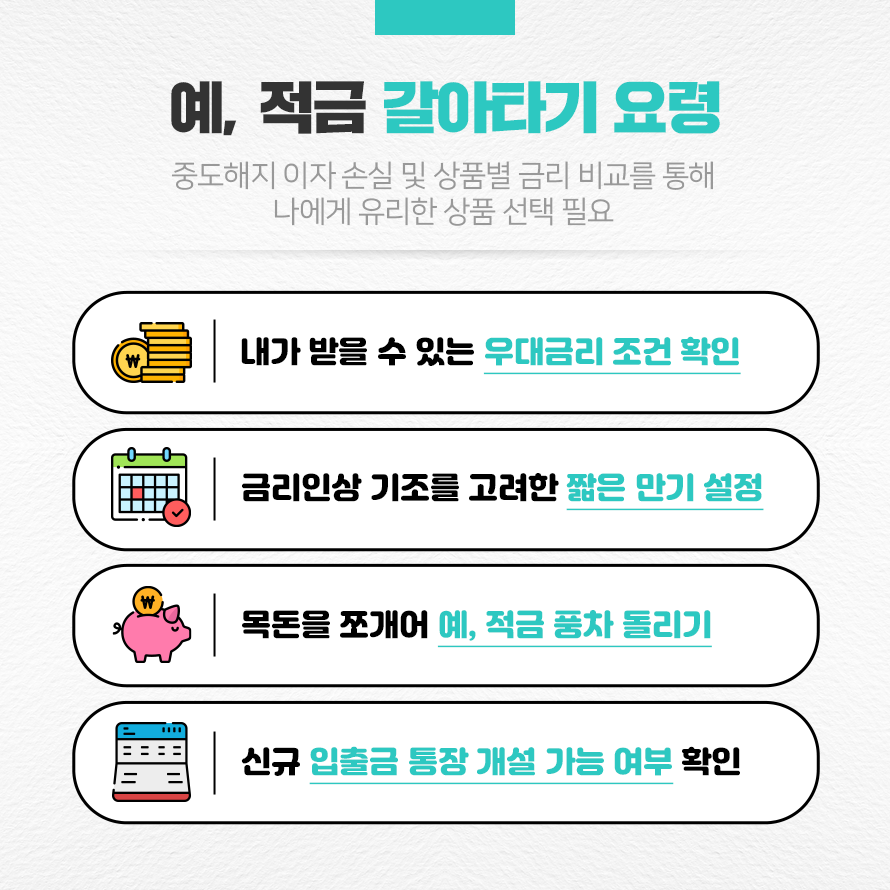 물론 새로운 예, 적금 상품으로 갈아탄다고 해서 무조건 이익을 보는 것은 아닙니다. 현재 가입된 상품을 중도해지할 경우 이자 손실이 발생하기 때문입니다. 따라서 중도해지 시 이자 손실과 상품별 금리를 비교하여 더 유리한 방향으로 선택하는 것이 현명한 방법입니다.