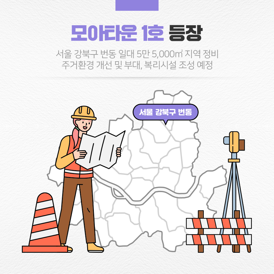 모아타운으로 선정되면 주거환경이 개선될 뿐 아니라 편의시설이 조성되게 됩니다. 서울 강북구 번동 일대는 모아타운 1호로 선정되며 주거환경이 개선되었습니다. 정비를 하기 전 해당 일대는 주거 환경이 노후한 지역으로 재개발 요건이 충족되지 않아 정비를 할 수 없는 곳이었습니다. 이에 서울시는 2022년 4월 21일 해당 일대를 모아타운 시범 사업지로 선정하였습니다. 그 결과 5만 5,000㎡ 지역이 정비되며 13개 동 총 1,240세대의 아파트와 부대 및 복리시설이 조성될 예정입니다.