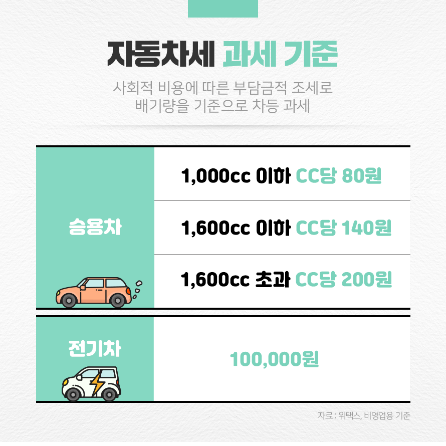 자동차세는 사회적 비용에 따른 부담금적 조세이므로 고가의 외제차든 저가의 승용차든 상관없이 배기량을 기준으로 차등 과세합니다. 비영업용 승용자동차의 경우 1,000cc 이하 일 경우 cc당 80원, 1,600cc이하일 경우 cc당 140원, 1,600cc 초과일 경우에는 cc당 200원을 부과합니다. 배기량이 없는 전기차의 경우 영업용 20,000원, 비영업용은 100,000원을 부과하며, 그 밖의 자동차는 크기 등에 따라 차등적으로 과세합니다.