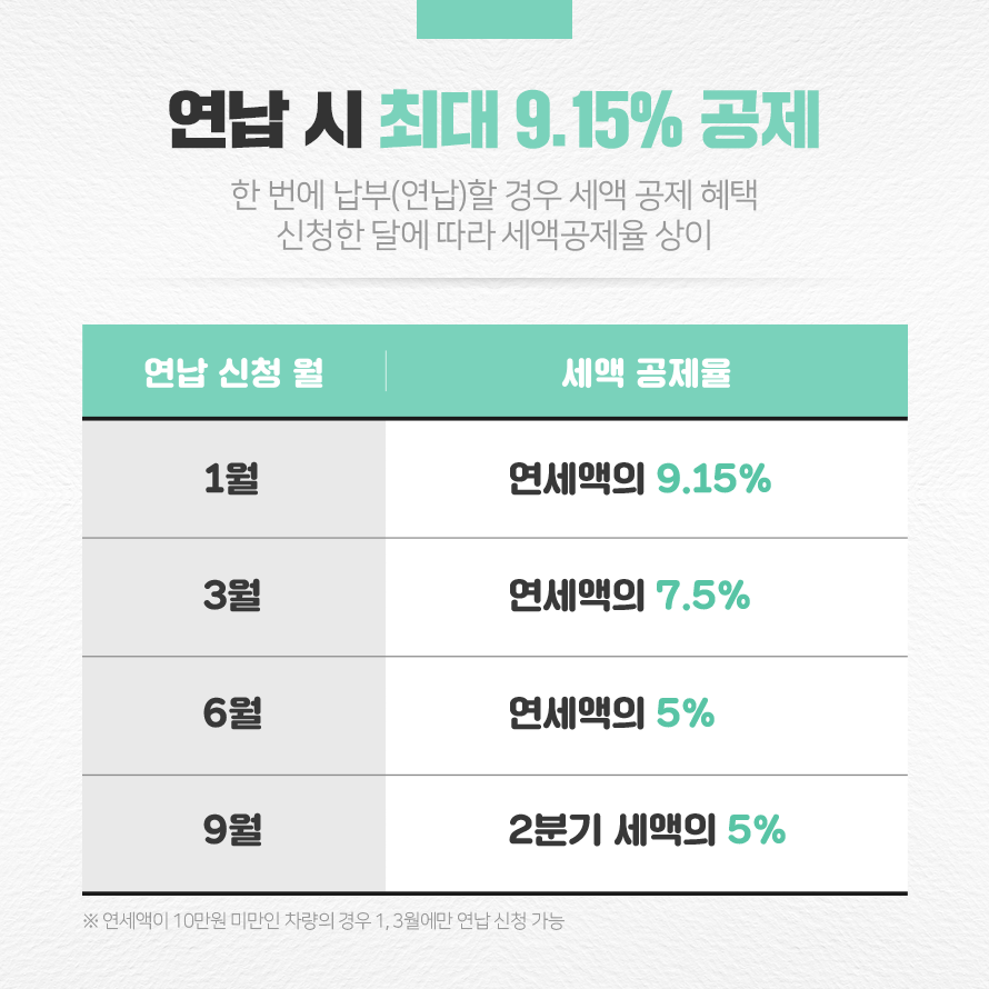 자동차세 연납 세액공제율은 신청한 달마다 다르게 적용됩니다. 1월에 미리 납부하면 연세액의 약 9.15%, 3월에는 연세액의 약 7.5%, 6월에는 연세액의 약 5%, 9월에는 2분기 세액의 약 5%가 공제됩니다.