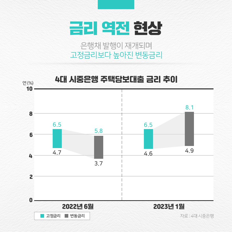 은행채 발행 수요가 풀리면서 은행채 5년물 금리 역시 2022년 12월 30일 기준 4.612%로 약 20일 만에 0.124% 낮아졌습니다. 은행채 금리는 고정금리를 설정할 때 근거로 활용됩니다. 따라서 은행채 금리 하락에 따라 주택담보대출 고정금리 역시 가파르게 하락하며 금리 역전 현상이 일어난 것입니다.