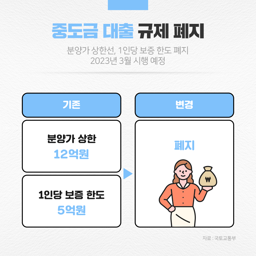 분양시장이 침체함에 따라 주택 공급은 물론 건설 경기 위축, 부동산 프로젝트파이낸싱(PF) 대출 부실 등 부동산 시장 전반에 대해 우려가 나오고 있습니다. 2022년 11월에 이미 한 차례 중도금 대출 규제를 완화했지만, 실수요자의 부담을 덜기에는 부족한 면이 있었습니다. 이에 국토교통부에서는 2023년 1분기부터 중도금 대출 규제를 폐지하기로 했습니다.