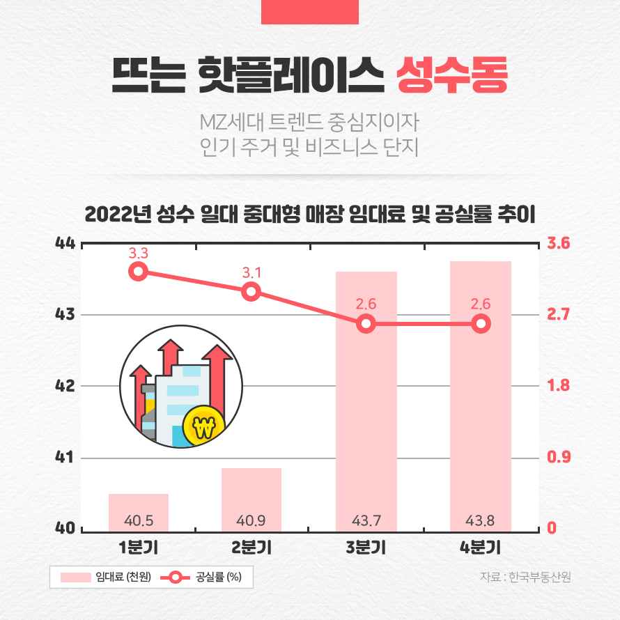 성수동에 대한 관심이 높아지며 부동산 가격은 상승하는 추세입니다. 한국부동산원에 따르면 2022년 4분기 성수동 일대 중대형 매장 임대료는 제곱미터(㎡)당 43,800원으로 전년 대비 16.8% 상승했습니다. 2022년 분기마다 꾸준하게 임대료가 올랐음에도 수요가 높아지며 공실률은 줄어들었습니다. 고급 주거단지의 신고가도 상승 추세입니다.