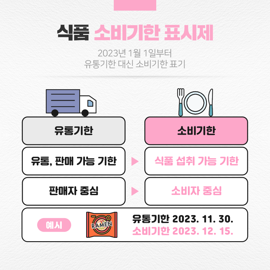 2023년 1월 1일부터 ‘소비기한 표시제’가 적용되며, 식품에 유통기한 대신 소비기한이 표기됩니다. 소비기한은 적절한 방법으로 보관했을 경우 안전하게 섭취할 수 있는 최대 기한입니다. 사용자 입장에서 섭취 가능한 시점을 알려준다는 점에 의의가 있습니다.